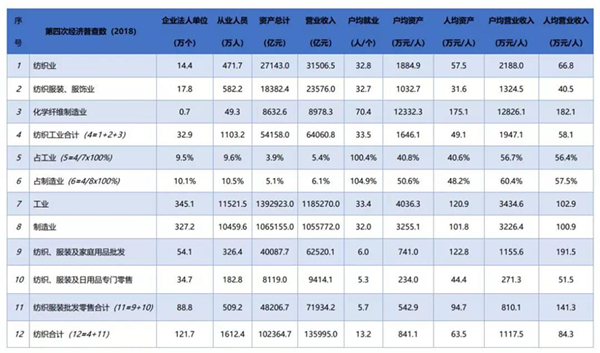 根据第四次全国经济普查(2018)数据显示,我国纺织工业企业法人单位32.9万个,占工业的9.5%,占制造业的10.1%;从业人数1103.2万人,占全国工业的9.6%,占全国制造业的10.5%,纺织行业总从业人数达1612.4万人(其中包含纺织服装批发零售从业人数509.2万人);总资产50111.0亿元,占全国工业的4.8%,占全国制造业的6.2%;总营业收入64060.8亿元,占全国工业的5.4%,占制造业的6.1%;人均营业收入58.1万元,相当于全国工业人均营业收入水平的56.4%,相当于全国制造业人均营业收入水平的57.5%。