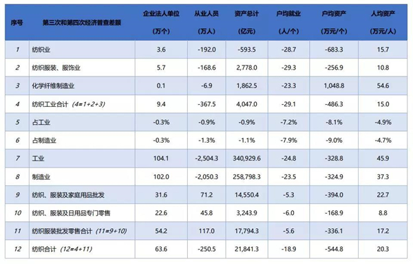 根据我国第四次全国经济普查(2018)和第三次全国经济普查(2013)数据显示,2018年,我国纺织服装批发、零售业总营业收入达71934.2亿元。5年来,我国纺织服装批发、零售业的企业法人单位数量增加了54.2万个,从业人数增加了117.0万人,总资产增加了17794.3亿元,反映了我国纺织服装业终端的繁荣流通景象。