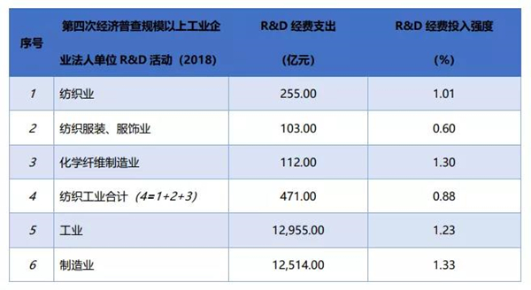 根据第四次经济普查规模以上工业企业法人单位R&D活动(2018)和第三次经济普查规模以上工业企业法人单位R&D活动(2013)数据显示,2018年,我国纺织工业的研究与试验发展(R&D)经费支出为471.00亿元,占全国工业的3.60%,占全国制造业的3.70%;研究与试验发展(R&D)经费投入强度为0.88%,相当于全国工业研究与试验发展(R&D)经费投入强度水平的71%,相当于全国制造业研究与试验发展(R&D)经费投入强度水平的66%;5年来,我国纺织工业的研究与试验发展(R&D)经费支出增加了176.40亿元,投入强度增加了0.41%。