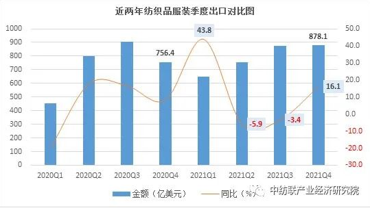 从各季度出口来看,上半年,由于国际市场需求复苏和2020年同期基数较小等原因,我国服装出口快速增长,一、二季度增幅分别为47.5%和34.9%。下半年,由于去年出口基数较高,三季度增速明显放缓,增幅为8.9%,四季度由于国外市场假日采购需求大涨的利好,增幅为20.5%。
