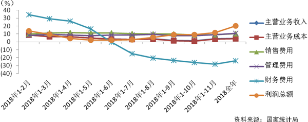 图 8 . 2018年家纺规模以上企业各月累计收入、成本费用及利润增长趋势