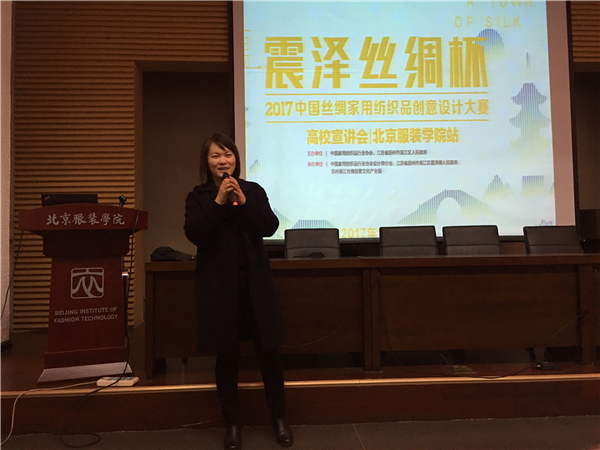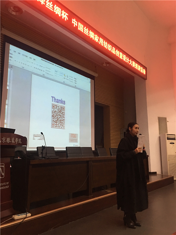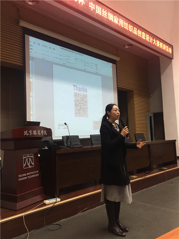 讲座尾声,首届震泽丝绸杯大赛评委、北京服装学院研究生导师刘晓萍教授作了总结性发言,她指出丝绸家纺类产品的广泛属性,要从过去、现在、未来为纵向切入点,指导学生打开思路,从大赛主题的理解入手,把握好人文格调,并捕捉准确的地域元素符号和相应的色彩去展开设计。最后倡导学生们积极参与大赛,利用震泽丝绸杯大赛的平台相互交流和学习。