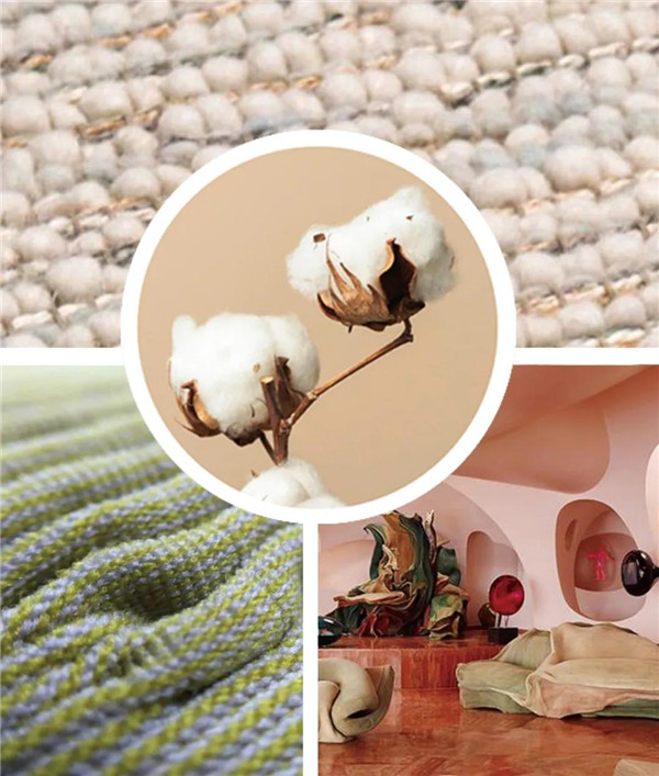 然有机材质, 以粗细不均的纱线、多种材质混纺织造出高低起伏的肌理;具有毛绒质感的雪尼尓、毛圈织物,通过精妙的触感、精湛的工艺、精细的处理、精致的细节还原出材质的原生高级感。既有良好的感官体验,还特别强调原材料溯源及品质的认证。