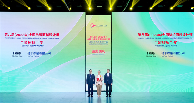 鲁丰织染有限公司产品设计科副科长丁继惠成为本届“金柯桥”奖获得者,孙瑞哲会长、袁建区长在颁奖典礼上进行了授奖。丁继惠致力于印染面料设计开发11年,在匹染和印花产品的组织设计、花型设计、功能性设计等方面具备全面的产品设计与开发能力。她表示,对面料设计工作的热爱是她不断进取的动力源泉。作为纺织面料设计师,需要不断提升自身的思维能力、审美能力以及学习能力,并对每个细节都追求完美,方能创造出更具有市场价值与时尚引领力的优秀产品。