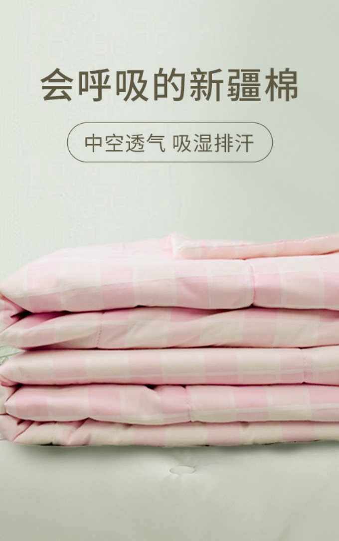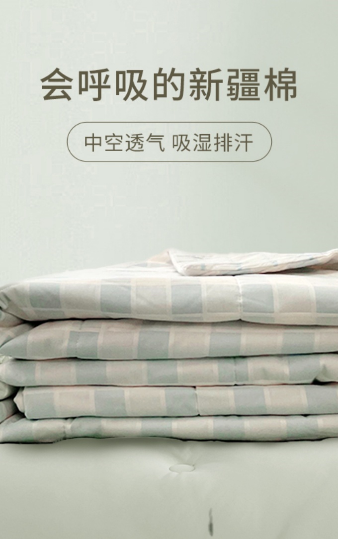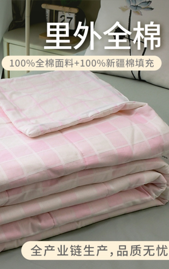 对花棉夏凉甄选国欣家纺自产“对花棉”为原料,实现纯棉面料+纯棉填充的全棉臻选,带来纯粹亲肤体验。采用六道洁净工艺,棉芯柔软洁净,自带天然棉香,亲肤低敏,不易滋生螨虫。核心填充部位运用专业针刺技术,使棉纤维紧密抱合,从根本上解决跑棉、结团问题,支持直接机洗,打理便捷。面料吸湿透气,夏日盖着清爽不闷汗,空调房中柔暖护肩,是追求天然与高品质睡眠的安心之选。