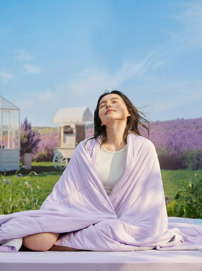 绘睡蚕丝薰衣草小冰被突破常规凉被单一凉感局限,打造兼顾温度、湿度、气味的多维助眠产品。面料采用高导热锦纶,导热系数约为棉的4倍,密针织造工艺搭配1.8倍国标Qmax值,触肤即凉。填充以桑蚕丝+莱赛尔+薰衣草组合替代传统丝绵,更加吸湿透气,同时薰衣草香能调节神经递质分泌,缓解压力,提升睡眠体验。产品使用针织被面,柔软亲肤,安全性上达GB31701-2015A类婴童级标准,抗菌防螨无甲醛。