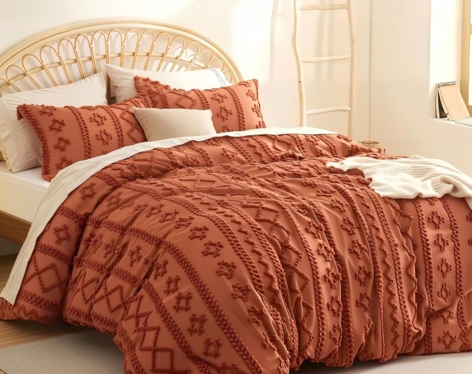 波西米亚之春件套灵感源自波西米亚异域美学,几何立体纹样与精致刺绣交织,为卧室注入浪漫高级氛围,化身治愈休憩秘境。甄选优质涤纶簇绒面料,触感如云般轻柔蓬松,透气性出色,肌肤尽享温柔包裹的舒适。高品质超细纤维搭配专业锁色工艺,色彩鲜亮、尺寸稳定,久用如新。