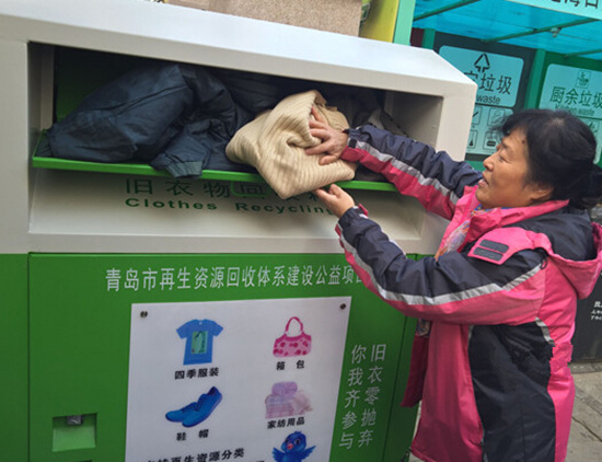 8日下午,青岛新闻网记者来到位于市南区台南路1号小区内一处旧衣物回收点。家住附近的市民高女士和邻居分别将自家闲置的旧衣物投进了回收箱。高女士说:"家里七八成新的衣服扔了可惜,送人又不知道送谁,放到这里真方便,还省去了捐衣服的运费。"