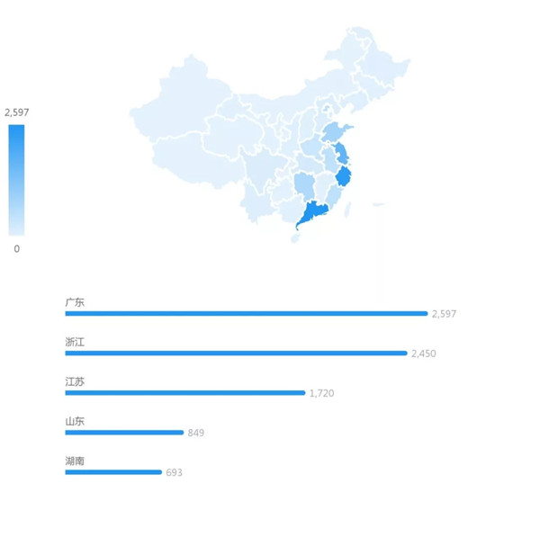 数据分析:从图表中我们可以看出知识产权纠纷多发生于南方,超过五百个案件以上的省份为湖南、山东、江苏、浙江、广东五个主要省份,而以广东、浙江、江苏为最多的,而相比而言,北方的各个省份纺织行业的纠纷数量在行业中处于相对偏低的状态。