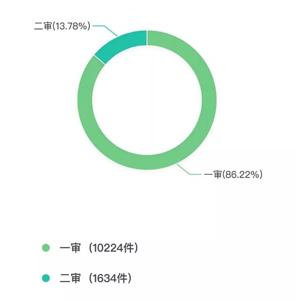 数据分析:我们看到和普通民商事诉讼不同的是,知识产权侵权案件的纠纷,一审裁判率为86.22%,而二审的裁判率只有13.78%,也即上诉率只有13.78%,基本都是一审就审结,选择上诉的案件较少,这是我们纺织行业知识产权侵权案件不同于其他行业以及其他纠纷的特点。