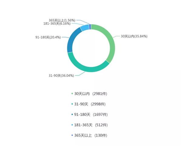 数据分析:由于大部分案件都是小标的额的案件,因此审理期限大部分在一个月至三个月,还有一部分案件是在3-6个月之内审结,在6个月以内审结的案件占比92.28%,只有小部分案件是审限超过6个月的。可见法院对于这类案件的处理属于正常的期限,基本很少出现拖延的情况。